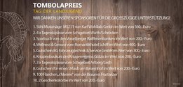 Über die tollen Tombolapreise freuten sich Carmen Vinzenz und Manuel Nenning (Geschenkskorb von den Sulzberger Käserebellen), Simon Burtscher (100 Flaschen Bier von der Brauerei Frastanzer), Theresa Schmidler (3 Tagesskipässe für das Schigebiet Lech/Arlberg), Reinhard Schwarz (Krippenbaukurs des Krippenvereins Götzis), Theresa Steurer (4 Tagesskipässe für das Schigebiet Warth/Schröcken), Manuel Kathan (Reparaturgutschein von BG Fahrzeugtechnik & Service), Bernd Gerer (200 Euro Sparbuch von den Vorarlberger Raiffeisenbanken), Pia Steurer (Wellness & Genuss vom Romantikhotel Schiff), Caroline Dünser (200 Euro Gutschein von Urlaub am Bauernhof) und Matthias Ilg über den Hauptpreis (Stihl Motorsäge MS 251 von der Firma Karl Wohllaib).