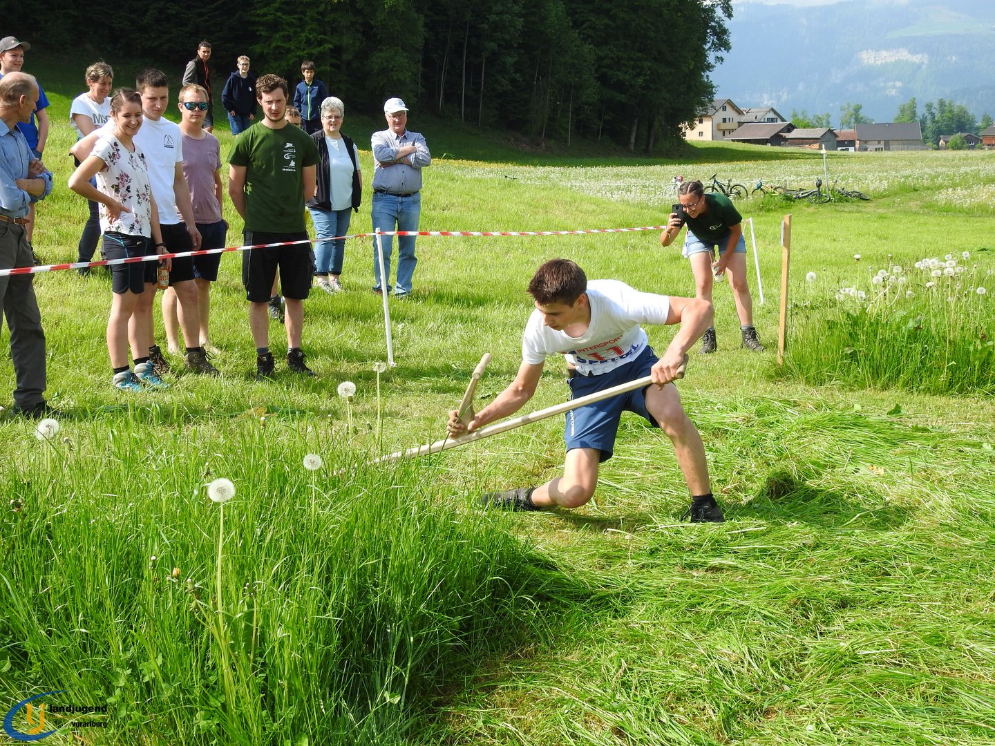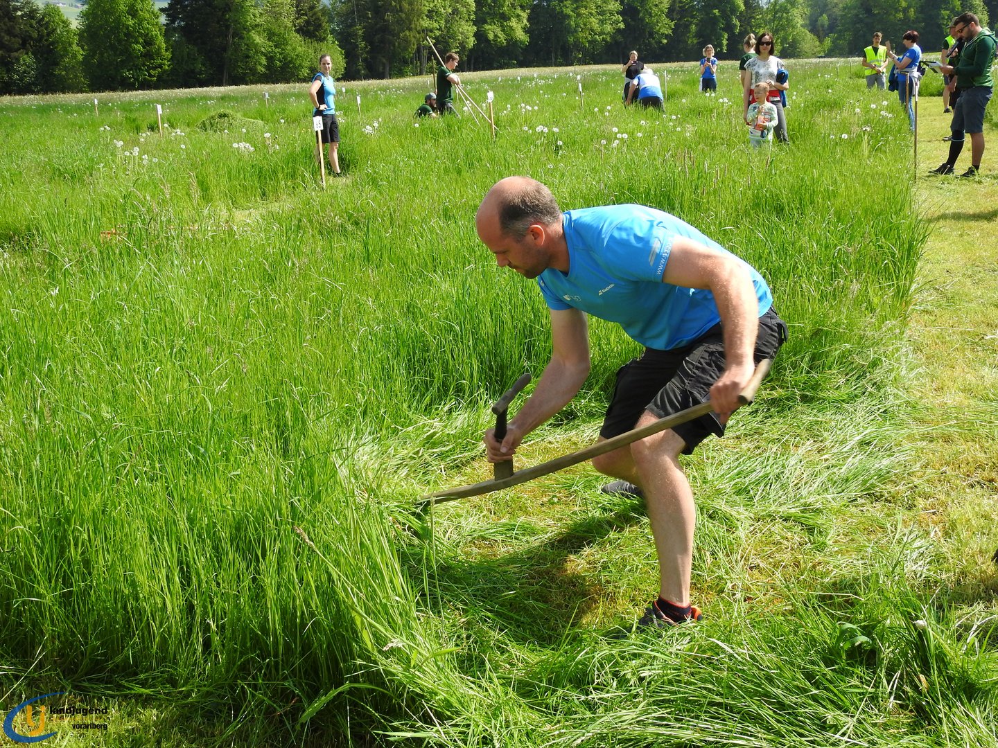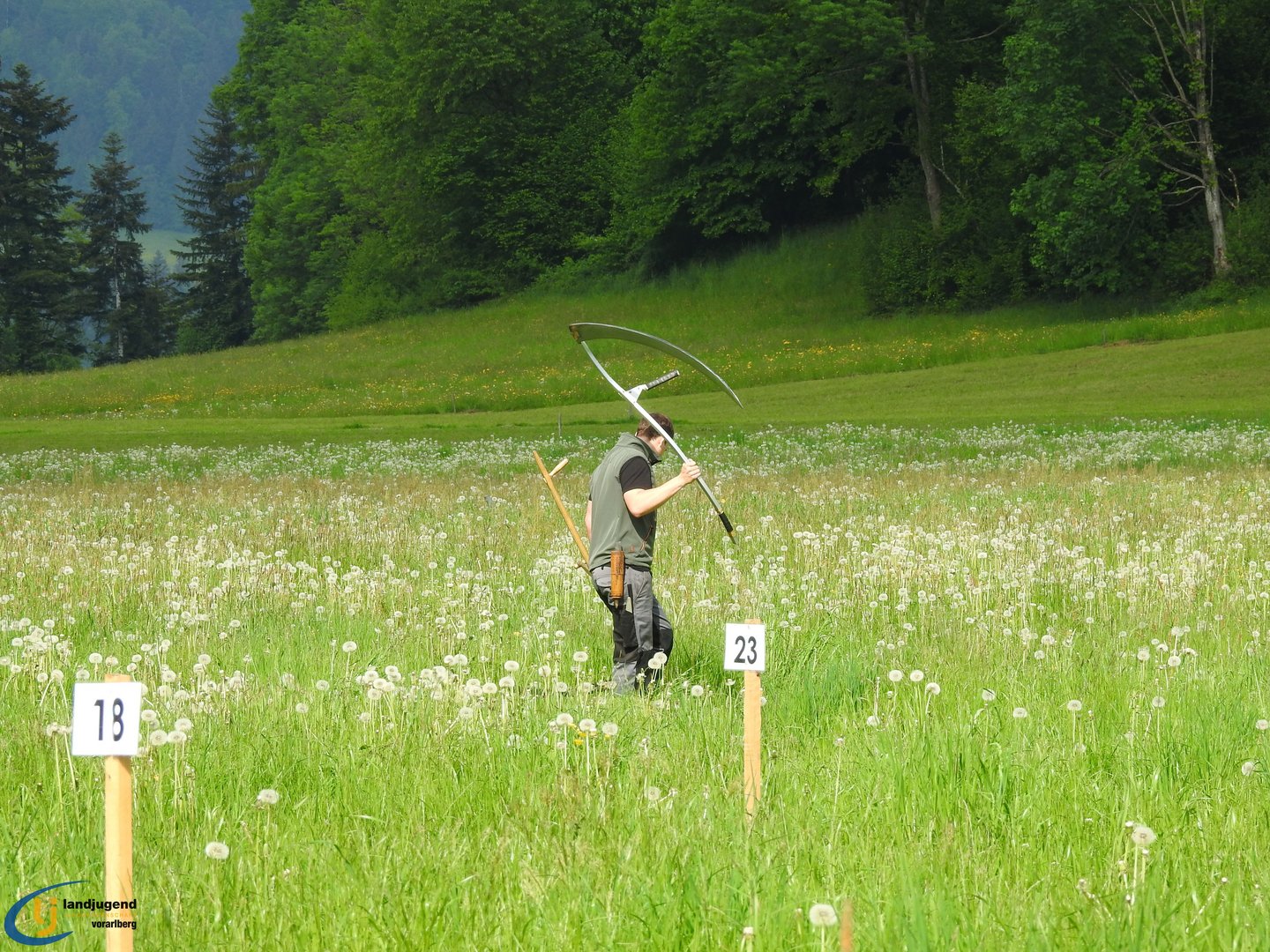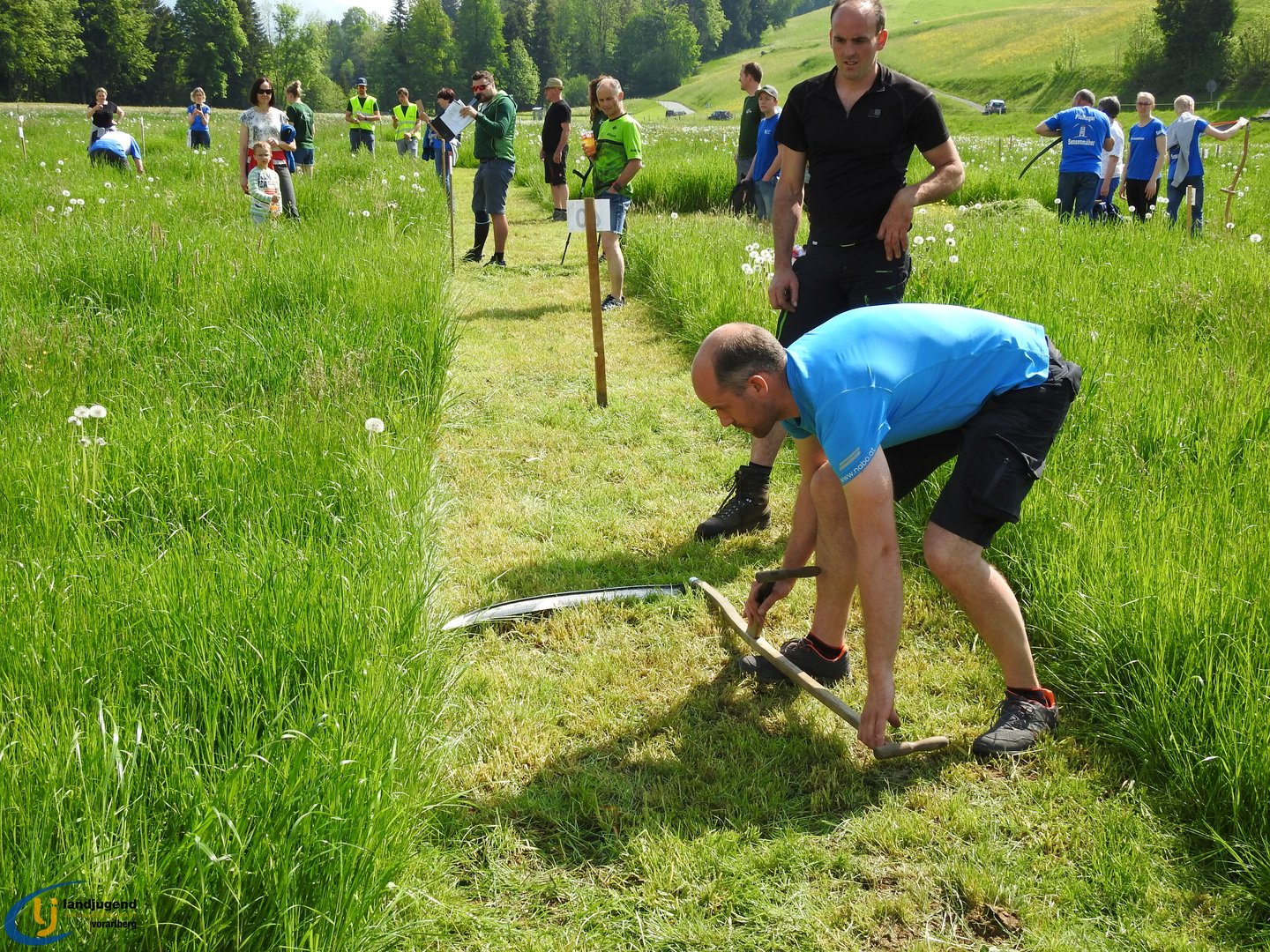 Etwas mehr als 30 Teilnehmer – zwischen fünf und 82 Jahren, Männer wie Frauen - reisten für dieses Spektakel nach Großdorf. Darunter Sportler aus Deutschland, der Schweiz, Liechtenstein, Steiermark, Salzburg und natürlich aus Vorarlberg. Der Wettbewerb wurde in unterschiedliche Klassen eingeteilt: Kinder, Damen und Herren Jugend, Damen und Herren Standard, Damen und Herren Big Battle sowie eine Senioren-Klasse. Zudem gab es mit der Kleinen und der Großen Staffel auch zwei Teambewerbe, bei denen eine Fläche zu dritt abgemäht werden musste. Nicht nur die Geschwindigkeit, mit der die Flächen abgemäht wurden war ausschlaggebend, sondern auch die Sauberkeit des Schnittes. Der Unterschied von der Standard-Klasse zum Big Battle und von der Kleinen zur Großen Staffel liegt darin, dass das Sensenblatt bei der Standard-Klasse und der Kleinen Staffel nicht länger als 90 cm sein darf. Beim Big Battle und der großen Staffel gibt es keine Begrenzung, dafür muss aber eine größere Fläche abgemäht werden. In der Klasse Herren Big Battle sind das dann schon stolze 100 m². Für die Vorarlberger Teilnehmer war das Internationale Handmähen gleichzeitig auch der Landesentscheid Sensenmähen. Das heißt, dass sich die besten Zwei jeder Klasse für den Bundesentscheid qualifiziert haben. Dieser findet heuer am 16. Juli in Feldkirch statt und wird von der Landjugend Jungbauernschaft Vorarlberg gemeinsam mit der Landjugend Jungbauernschaft Vorderland und der Landjugend Österreich organisiert. Zum ersten Mal wird es heuer auch eine Kinderklasse beim Bundesentscheid geben.