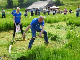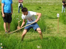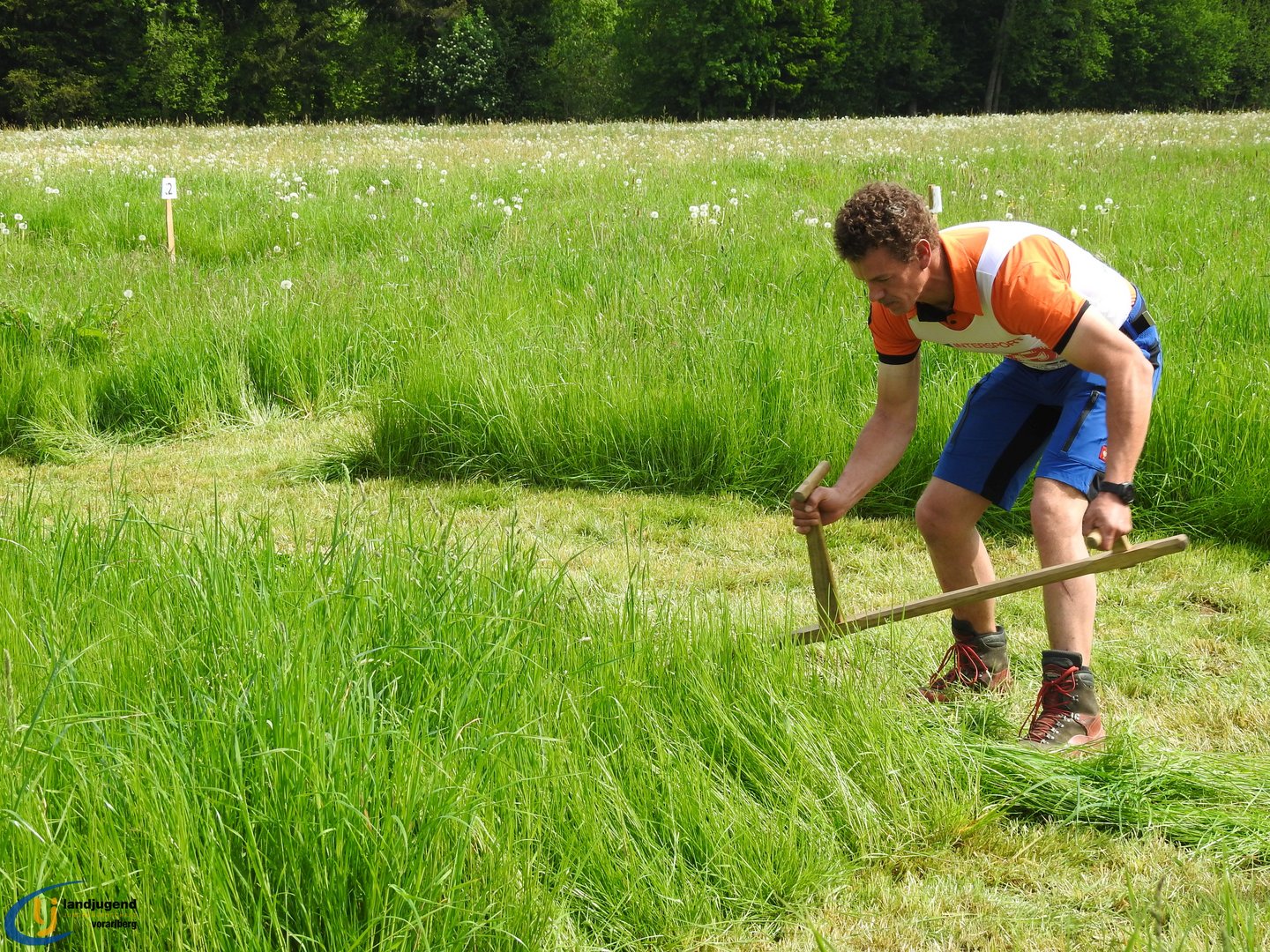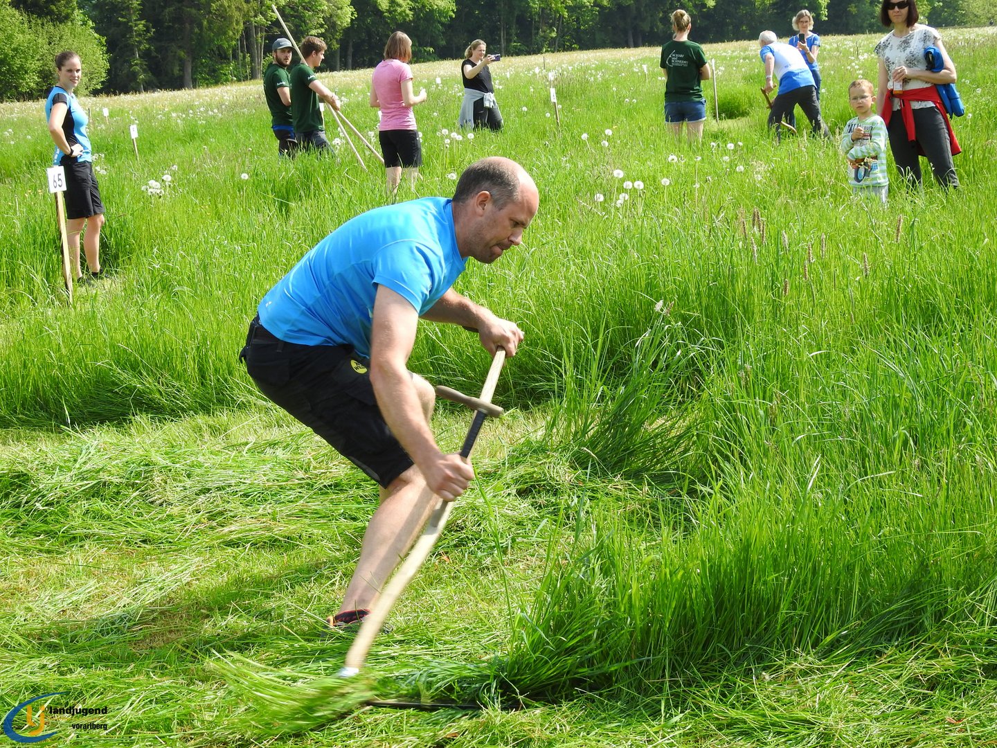 Der Sensenmäh-Wettbewerb hat bei der Landjugend schon Tradition. In der Praxis kommt das Sensenmähen an Hängen und im Berggebiet zum Einsatz, dort wo Maschinen keine Chance mehr haben und daher viel Muskelkraft und Ausdauer gefragt sind. Beim Mähwettbewerb geht es vor allem um die Schnelligkeit, Regelmäßigkeit und Sauberkeit der Mahd. Mehrere Teilnehmerinnen bzw. Teilnehmer treten im direkten Wettstreit auf ihren gelosten Parzellen gegeneinander an. Eine besonders spannende Situation für das Publikum, das hautnah, direkte Vergleiche anstellen kann. Ist die Fläche komplett abgemäht, wird das Gras von den Helfern zur Seite gebracht und von der dreiköpfigen Jury kontrolliert, welche bei unsauberem Ergebnis Zeitzuschläge vergibt. Es gewinnt, wer die geringste Gesamtzeit - also Summe aus gemessener Mähzeit und Zeitzuschlag - erzielt.