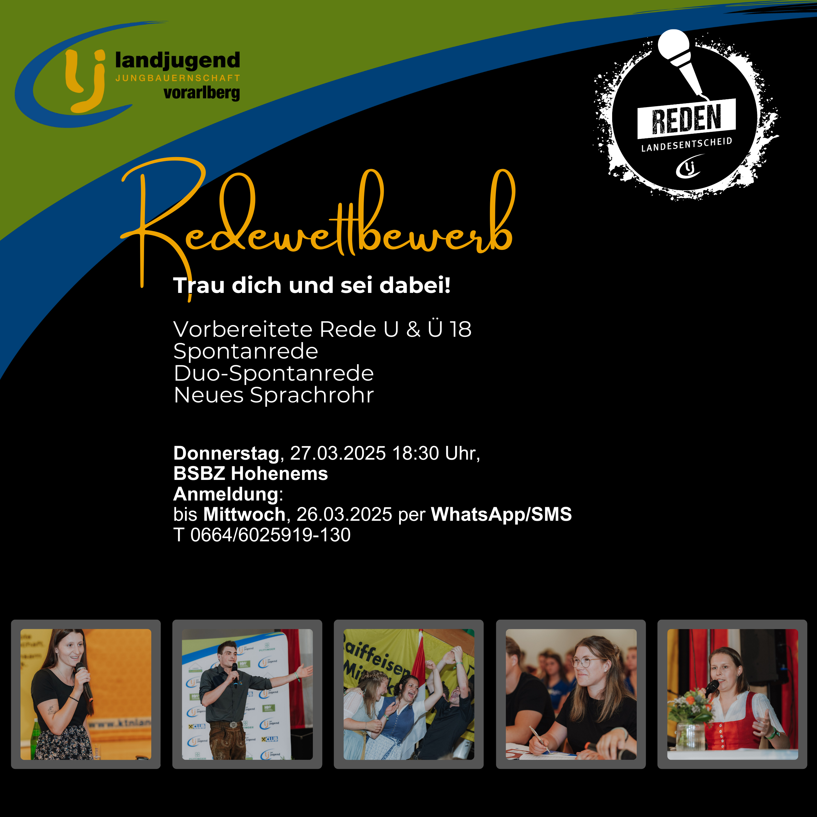 Hohenems, 27. März 2025 – Klar, mutig und mit viel Persönlichkeit: Beim Redewettbewerb der Landjugend Jungbauernschaft Vorarlberg im BSBZ Hohenems zeigten junge Menschen aus dem ganzen Land eindrucksvoll, was sie bewegt. In vorbereiteten und spontanen Redebeiträgen teilten sie ihre Gedanken zu aktuellen Themen und gaben dabei auch viel Persönliches preis.