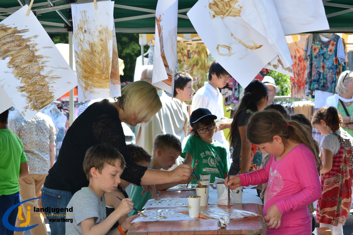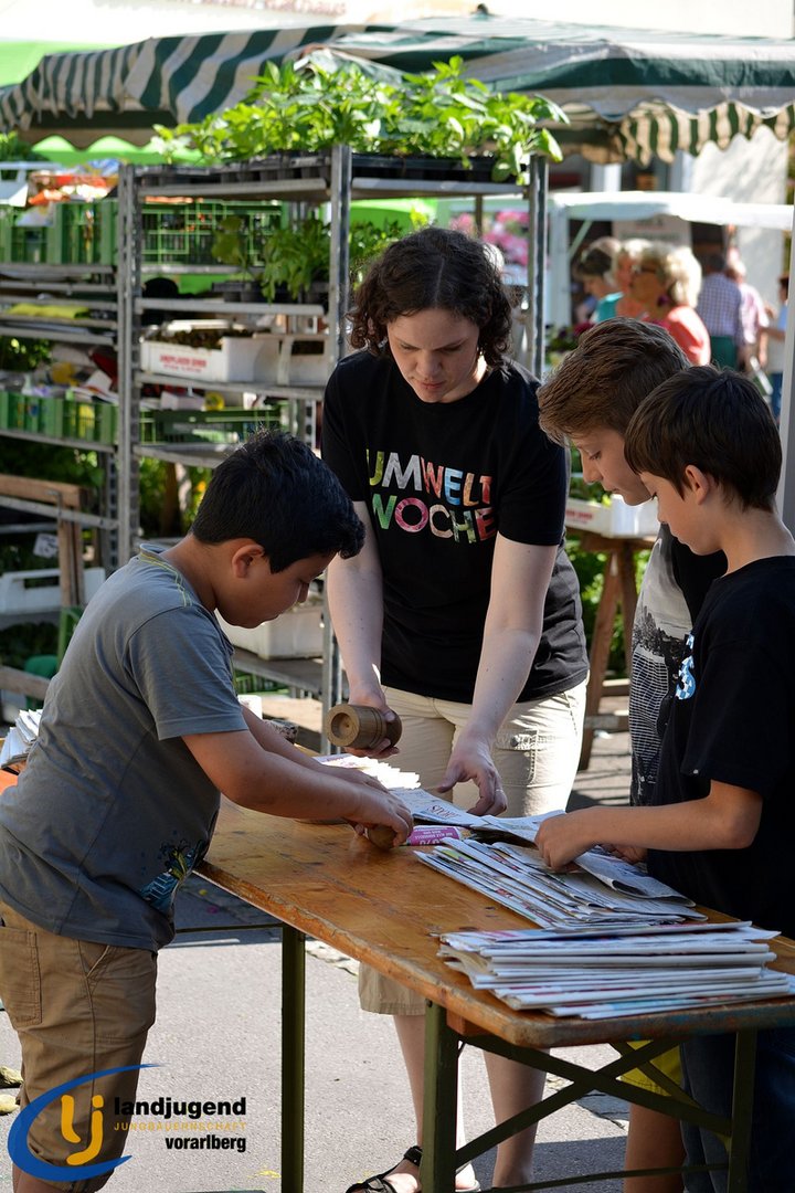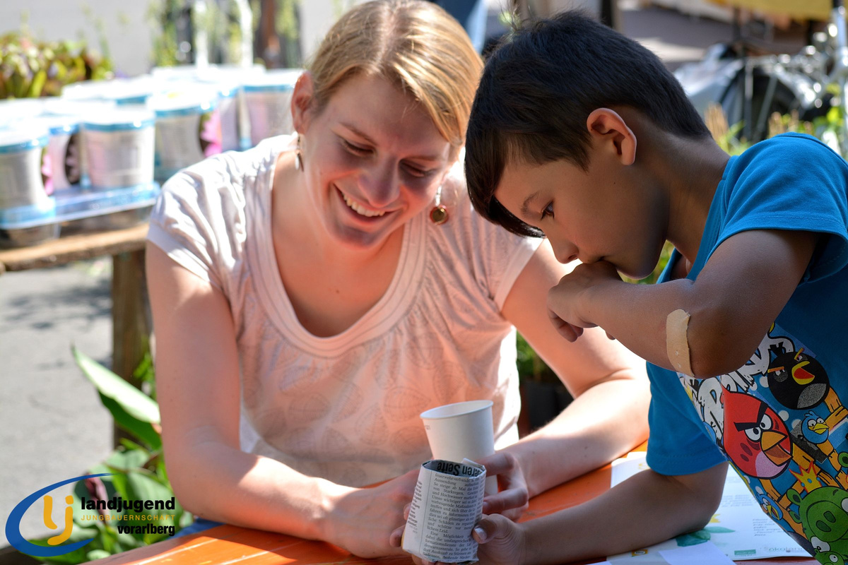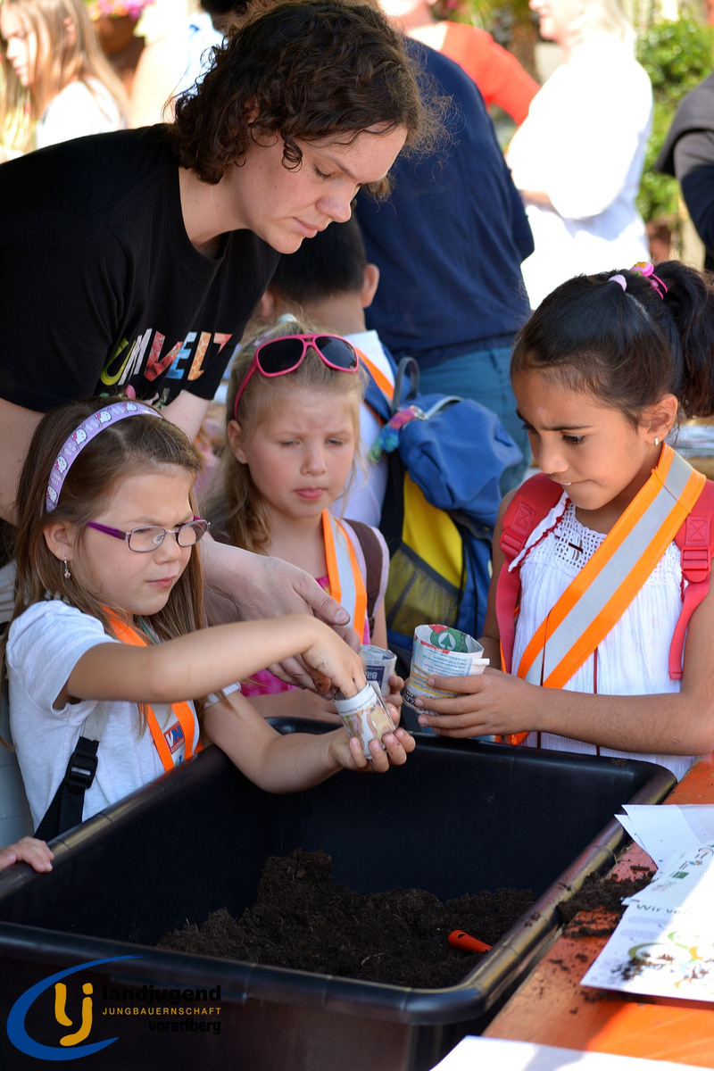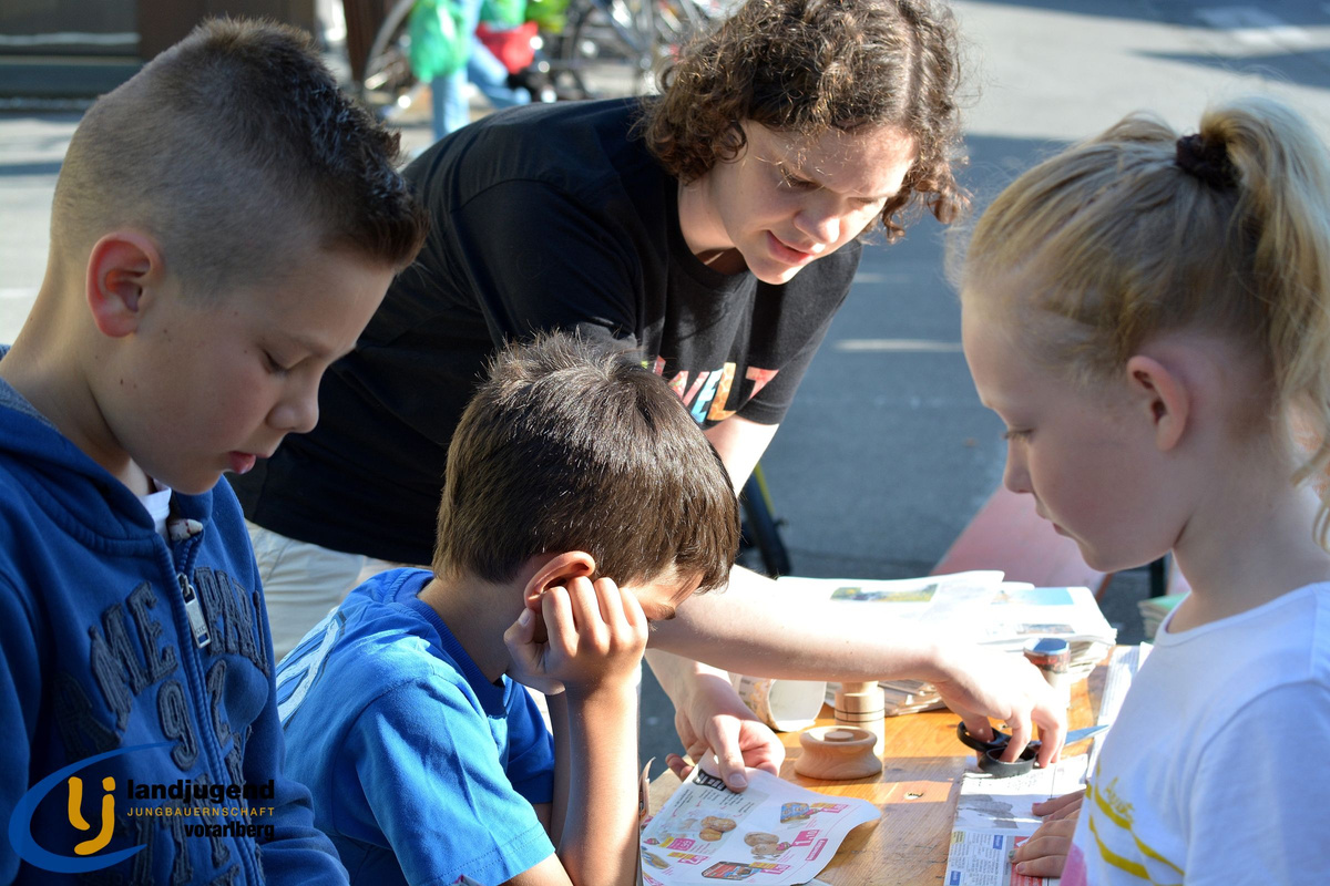Am Mittwoch, 3. Juni gab es für die Harder Kinder der Kindergärten Seezentrum und Kunterbunt am See sowie Klassen der Volksschule Markt und der Mittelschule Markt auf dem Harder Markt Einiges zu erleben. Die Marktgemeinde Hard hatte zum Aktionstag "Lebensmittel sind kostbar - Verwenden statt verschwenden" eingeladen. Beim Kühlschrankspiel erlernten die Kinder spielerisch, welche Lebensmittel in welchem Bereich des Kühlschranks gelagert werden sollten. Und erfinderische Leute konnten mit einem Tipp gegen Lebensmittelverschwendung am Gewinnspiel teilnehmen und Honig gewinnen. Doch damit noch nicht genug: Die Landjugend Jungbauernschaft Vorarlberg, Verein vom Ländle Bur, Abt. Landwirtschaft des Landes Vorarlberg, Bio Austria Vorarlberg und Schule am Bauernhof boten verschiedene Aktivitäten an. Tanja Pitter war Herrin über die Erdfarbentöpfe und regte die Kinder an, ihre Gedanken zum Thema Bauernhof gemalt zu Papier zu bringen. Ein wenig Geschick oder Hilfe von Elisabeth Zeiner oder Barbara Geißler brauchten die Schüler zur Herstellung von Anzuchttöpfchen aus Zeitungspapier. Beate Bück half dann beim Befüllen der Töpfe mit Erde und beim Säen von Sonnenblumen. Mit transportfähig verpackten Blumentöpfchen und den Erdfarben-Bildern ging es für die Kinder wieder zurück in den Kindergarten oder das Klassenzimmer. Auch die erwachsenen Marktbesucher gingen nicht leer aus. Informationsmaterialien über den Bodenverbrauch in Vorarlberg wurden von der Landjugend Jungbauernschaft verteilt und von den Wochenmarktbesuchern dankend angenommen.