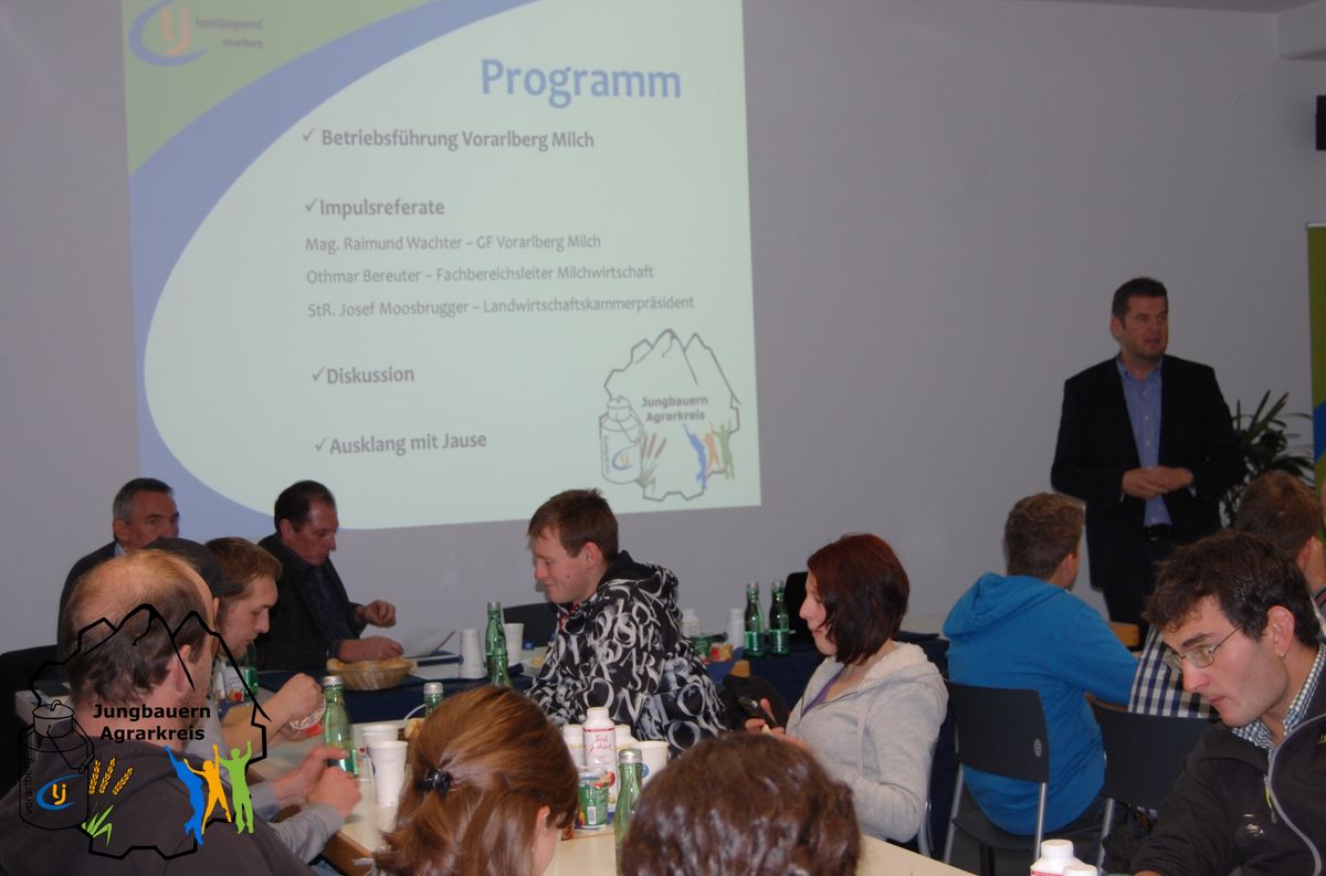 Als Start in das neue Vereinsjahres gründete die Landjugend Jungbauernschaft Vorarlberg den VORARLBERGER JUNGBAUERN AGRARKREIS. Dieser Jungbauern Agrarkeis soll Junglandwirten und Junglandwirtinnen so wie Hofübernehmer/-innen eine Plattform bieten sich fachlich auszutauschen, zu diskutieren und neues kennenzulernen. Fünf Schwerpunk-Veranstaltungen über das ganze Jahr verteilt sind vorerst geplant. Dabei handelt es sich um fachliche Exkursionen, Diskussionen, Referate von Experten, sowie agrarpolitische Gespräche zu bestimmten land- und forstwirtschaftlichen Themen. Die Auftaktveranstaltung zum ersten Vorarlberger Jungbauern Agrarkreis veranstaltete die LJ/JB Vorarlberg am Mittwoch, 26. November bei der Vorarlberg Milch in Feldkirch. Passend zum Veranstaltungsort stellte die Landjugend diesen Abend ganz unter das Thema Milch. Über 40 Teilnehmer/-innen bekamen bei der Betriebsführung durch die Vorarlberg Milch einen Einblick in die Organisation und in die Abläufe des Betriebes und konnten am eigenen Auge sehen, was da tagtäglich geleistet wird. Anschließend versammelten sich die Teilnehmer/-innen im Veranstaltungssaal der Vorarlberg Milch und durften viel Neues und interessantes bei den Impulsreferaten von Vorarlberg Milch Geschäftsführer Mag. Raimund Wachter, Othmar Bereuter Fachbereichsleiter Milchwirtschaft und Landwirtschaftskammerpräsident StR. Josef Moosbrugger erfahren. Im Anschluss lud Landesobmann Bernhard Schrottenbaum die Junglandwirte und Junglandwirtinnen bei einer Jause zur Diskussion über die mit Gesprächsstoff gefüllten Kurzreferate ein.
